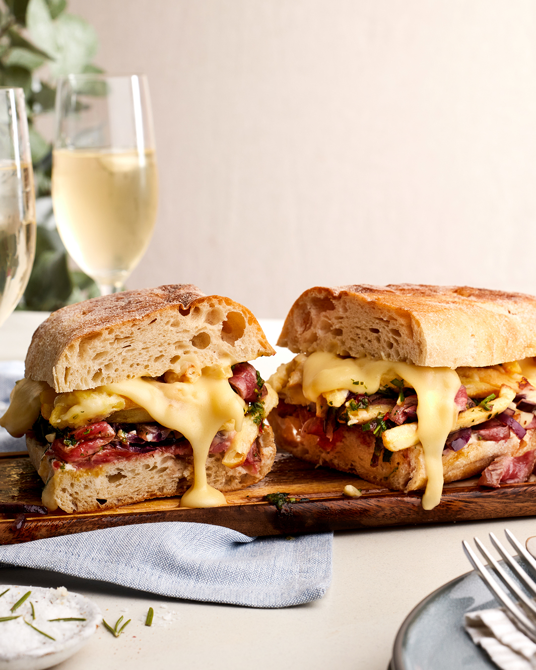 - Slice your Ciabatta down the middle and spread mayonnaise on one side. Top with your softened onions then thin slices of steak. Add your fries and chimichurri sauce, then top with melted Raclette cheese. Slice into strips.