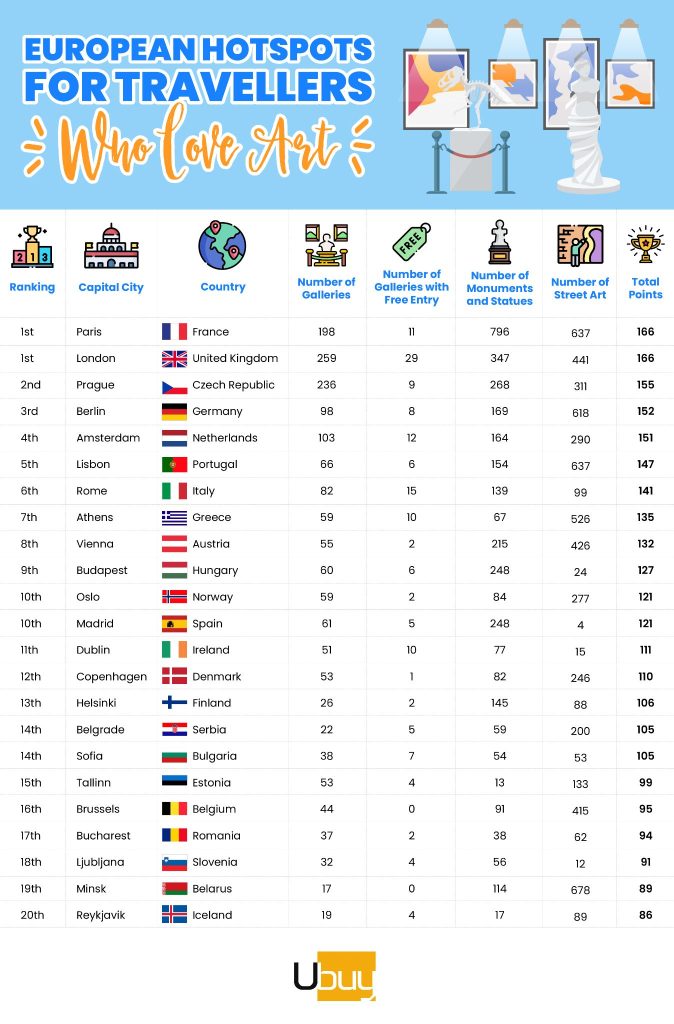 Ubuy, a global ecommerce platform, has undertaken new research to find which of Europe’s capital cities offers the most opportunities to see art. This list of the top 20 European capitals for art lovers to visit is based on the number of art galleries, galleries with free entry, statues and monuments, and works of street art.