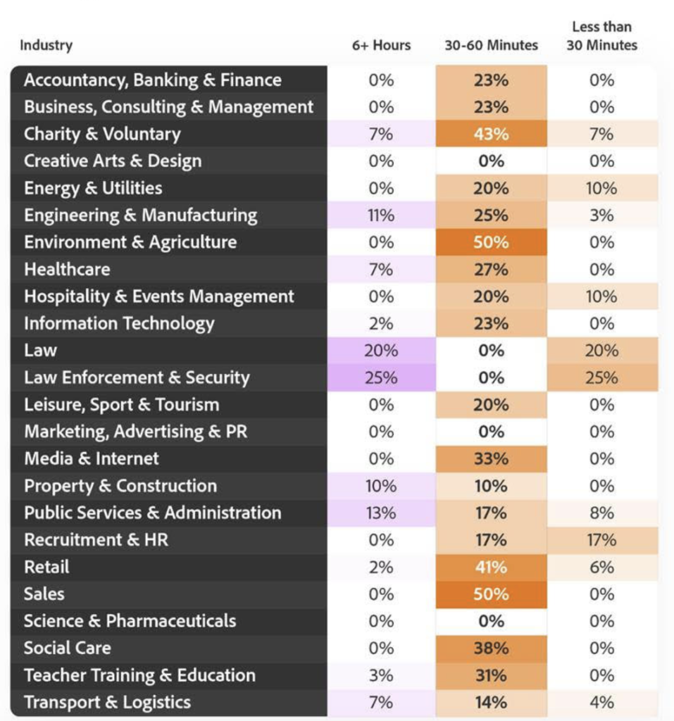 Adobe Express has conducted an extensive study2, to find out exactly which industries and cities are doing the most overtime, how much extra time is being spent, and why employees feel forced to work beyond contracted hours.