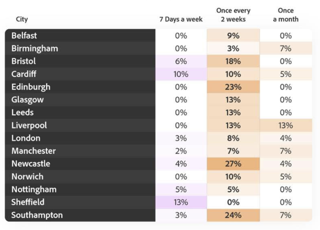 Cardiff is officially the city working the most hours of overtime, with 14% working more than six hours each time, followed by Liverpool (9%), and Southampton (7%). In Bristol, 41% are spending between 30-60 minutes working after hours each week, with Sheffield following closely behind at 38%. 14% of people in Cardiff are spending less than 30 minutes on overtime each session, the lowest amount of time out of all cities. The full listings can be found below: